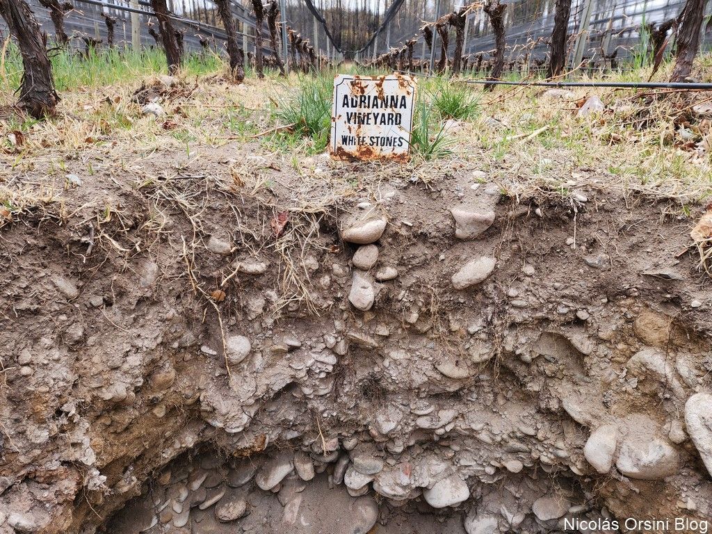 Según cuenta la propia Laura Catena en el sitio de la bodega, “Lo que descubrimos es que cuando se formaron hacia el norte las lomas del Jaboncillo y el Peral, la actividad sísmica llevó a que el río que atravesaba el viñedo Adrianna se dirigiese gradualmente hacia el sur formando una serie de terrazas, con depósitos de calcáreo al secarse. Y, según la velocidad e intensidad de los terremotos que formaron las lomas y montañas, el río debió fluir en diversas direcciones dejando consigo depósitos de piedras blancas y carbonato de calcio, que es lo que hoy vemos en el Viñedo Adrianna”.